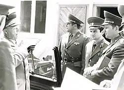 Former commander of the 4th Guards TA D.D. Lelyushenko, commander of the 81st Guards MRR A.V. Stepanov, head of the PO K. Khronusov, commander of the 6th Guards MRD A.A. Dorofeev in the barracks. Eberswalde, 1983.