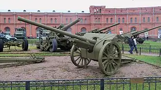 The M1933 was a transitional type between the modernized 76 mm divisional gun M1902/30 and the 76 mm divisional gun M1936 (F-22). It followed an established pattern of mating a new gun barrel with an existing carriage from the 122 mm howitzer M1910/30. The gun was equipped with a box trail, unsprung spoked wheels, gun shield, hydro-pneumatic recoil system and was chambered in the standard 76.2 × 385mm R. Despite being considered a stopgap until the adoption of the M1936, some were still on hand during the opening phases of World War II. The German designation for the gun was 7.62 cm FK 298(r), but it is not known if the Germans used the type.[1]