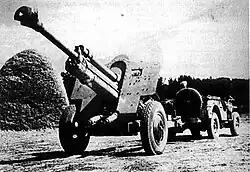 The 76-mm divisional gun M1939 (F-22 USV or USV) (Russian: 76-мм дивизионная пушка обр. 1939 г. (Ф-22 УСВ or УСВ)) was a 76.2 mm cannon produced in the Soviet Union. It was adopted for Red Army service in 1939 and used extensively in World War II. The gun was designated as "divisional" - issued to batteries under the direct control of division headquarters. The F-22 USV was an intermediate model, coming between the F-22, which had limited anti-aircraft capability, and the simpler and cheaper ZiS-3, which eventually replaced it in production and service.
