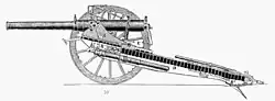 The gun has an upper and a lower gun-carriage. The upper gun-carriage slides, resting on grooves along the rail of the lower gun-carriage. In the trail is an oil buffer, acting as a recoil brake, which includes 40 india-rubber doughnuts which were compressed when the gun was fired. After the recoil stroke the doughnuts expanded again and the barrel returned into firing position.[8]