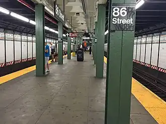 The platform and mezzanines above have dark green columns, and alternate columns have the standard black station name plate with white lettering reading "86 Street".[52][53] The track walls had their mosaic tiling restored as part of the station's 2011 renovation.[54][52] The southern section of the station is where the platform was extended in 1970, and they have no mosaic trims or tiles along the wall, instead including an extension of the tunnel benchwall.[23] The platform has several employee-facilities that have a mosaic trim line.[55]