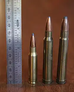 8mm Remington Magnum (center) with .308 Winchester (left) and .375 H&H Magnum (right). | ||||||||||||||||||||||||