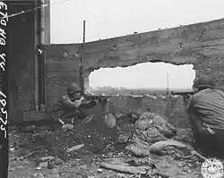 357th Regiment, take shelter behind a blasted wall and keep an eye out for enemy snipers, near Maizeres Les Metz, France.