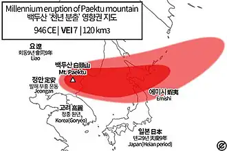 The 946 eruption of Paektu Mountain, a stratovolcano on the border of North Korea and China also known as Changbaishan,[1] occurred in late 946 CE.[2][3] This event is known as the Millennium Eruption or Tianchi eruption.[4] It is one of the most powerful volcanic eruptions in recorded history; classified at least a VEI 6.[5][6][7]