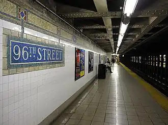 A crossover is provided, with a mosaic in the mezzanine entitled City Suite, commissioned in 1994. There are new "96th Street" mosaics, and a window in the mezzanine overlooks the tracks, giving a view of oncoming trains from the south. The south end of the station features a rounded ceiling due to problems encountered during construction. Both platforms have emergency exits from the lower level express tracks.