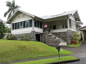 The A.J. Williamson House is a historic house located at 31 Halaulani Place in Hilo, Hawaii. The house was built in 1921 for engineer A.J. Williamson. At the time, Halaulani Place was one of the most desirable neighborhoods in Hilo. The house has a Craftsman design; the style was popular in Hawaii at the time due to its emphasis on natural materials and features. The one-story house rests on a lava rock base, which is nearly a story tall itself. The corrugated metal roof features overhanging, bracketed eaves and decorative vents below its gable ends.[2]