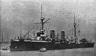 Its main battery was two 210-millimetre (8 in) guns,[1] one at the bow and another at the stern, and four 124 mm quick-firing guns per side. The secondary battery had twelve 47 mm and twelve 37mm quick-fire Hotchkiss guns. It had two masts, in its tops were mounted eight Maxim machine guns. It initially mounted three torpedo tubes, later increased to six. It also carried two steam boats with spar torpedoes.