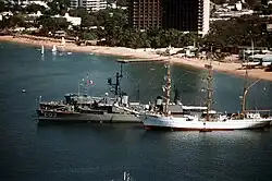 Starting in 1969, Durango began making long training cruises with cadets, beginning with a voyage to the Pacific, visiting Samoa, Sydney, Wellington, and Tahiti.[26] In 1970, it sailed to Panama, Venezuela, Brazil, and Colombia, and in 1971 to Europe, reaching as far as Antwerp.[26] During this period, the hull number was changed to B-1 under a new system.[k] In 1974, the ship delivered medical supplies and doctors to Puerto Cortés after an earthquake in Honduras.[26] By the late 1970s, the ship was inactive but was later restored to service.[10] It participated in fleet maneuvers, mainly as a transport or staff ship, including in 1981 ("Antigua-81") and 1983 ("Patria-83").[26] During this period, by the early 1980s, the hull number was changed to B-01.[k] In the 1980s, Durango also served for several years in a program for the rehabilitation of juvenile offenders through maritime practice.[26]