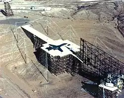On the other side of the platform was the transmission "wedge", 250 feet in length with a total height of 240 feet.[6] The wedge was constructed using steel I-beams. The entire structure was covered with a wire mesh similar to livestock fencing in order to create an enormous Faraday cage. A multistory building was constructed inside the wedge which served as offices, laboratories and testing facilities. The second floor of the building housed a large electromagnetically shielded room, supplied by Electromagnetic Filter Company of Palo Alto, California, which contained the data acquisition electronics, the Marx generator charging and firing control and field strength monitoring instrumentation. The data acquisition system consisted of a large number of state-of-the-art Tektronix 7912AD digitizers along with a large array of Digital Equipment Corporation PDP-11 computers. The pulse monitoring instrumentation consisted of a number of B dot and H field sensors mounted on the exterior of the wedge connected to oscilloscopes fitted with Polaroid cameras to capture the transient pulse data. The open-air third floor held large inflatable gas bags which could store the sulfur hexafluoride (SF6) gas from the Marx generator enclosures when they needed to be opened for maintenance.