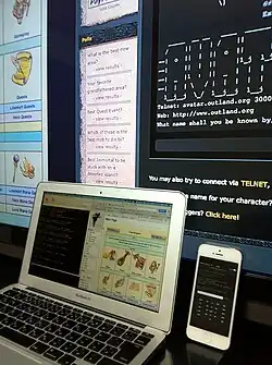 A smartphone, laptop and desktop system connected to AVATAR MUD using different clients. A player-created wiki can also be seen on two of the screens.