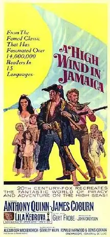 A High Wind in Jamaica is a 1965 DeLuxe Color adventure film, based on the 1929 novel of the same name by Richard Hughes, and directed by Alexander Mackendrick[3] for the 20th Century-Fox studio. It stars Anthony Quinn and James Coburn as the pirates who capture five children. Other cast members include Deborah Baxter, Nigel Davenport, Isabel Dean, Lila Kedrova, Kenneth J. Warren, and Gert Frobe. One of the child actors is the author Martin Amis.
