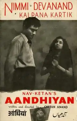 Aandhiyan (English: Cruel Winds) is a 1952 Hindi drama, written and directed by Chetan Anand. The story was written by Chetan Anand and Hameed Butt, and was based on an actual event in Amritsar. It stars Dev Anand, Kalpana Kartik, Nimmi in lead roles.[1] The music of the film was composed by the classical musician Ali Akbar Khan, with lyrics by Narendra Sharma.