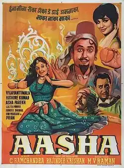 Aasha (transl. Hope) is a 1957 Indian Hindi-language romantic comedy film directed by M. V. Raman. It stars Kishore Kumar and Vyjayanthimala. The film was a critical and commercial success.[1] This film was partly coloured by both Gevacolor and Technicolor. The film was remade in Tamil as Athisaya Penn. Asha Parekh appears in the song 'Chal Chal Re Kanhai' and one scene after it with Vyjayanthimala.