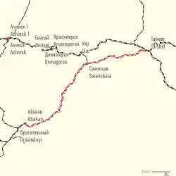 The Abakan-Taishet Railway is a railway built between 1959 and 1965, connecting Abakan with Tayshet on the Trans-Siberian Railway. It lies in Krasnoyarsk Krai along with parts of the Republic of Khakassia and Irkutsk Oblast. The line is a continuation of the Novokuznetsk - Abakan Railway which was built between 1949 and 1950. Construction of the Abakan-Taishet Railway was announced as a Komsomol shock construction project, and young workers came from all parts of the Soviet Union to build the line.