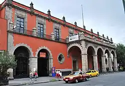 The Abelardo L. Rodriguez market has four large entrances on República de Venezuela, República de Colombia, Del Carmen and Rodríguez Puebla streets respectively.[1] One unusual feature of the building is the metal roof that covers the central patio area. Its most distinctive service is the Teatro del Pueblo (Theatre of the People) auditorium, which is located on the upper floor.[3] A number of the services and features of this market were copied in markets built as much as twenty years later, such as the markets of La Lagunilla, Tepito and La Merced.[4]