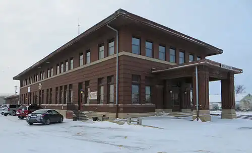 The depot is rectangular in shape, two stories, and is built of brick and concrete. Its style reflects the Craftsman/Prairie influences of the early 20th century. It was built to replace an earlier wooden depot that burned. Aberdeen served as a division point on the Milwaukee Road and the upper floors of the depot contained railroad offices. In its heyday the station served the Milwaukee Road's Olympian Hiawatha, which ran from Chicago to Seattle and Tacoma.[1] Passenger trains last served the station for Minneapolis on April 17, 1969.[2][3]