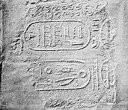 ![]() The Abibaʻl Inscription in Phoenician letters. The Egyptian hieroglyphs are the cartouches of Sheshonq I | |