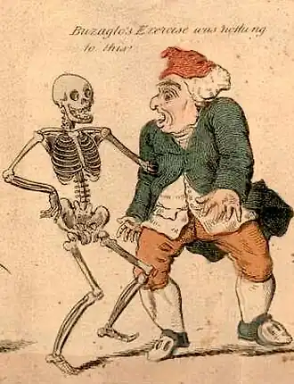 - Isaac Cruikshank after George Moutard Woodward, detail, British Museum. The figure is one of 24 in which a character ends up in a dance with death. In this one (No. 22) a gouty old man exclaims "Buzaglo's Exercise was nothing to this!"