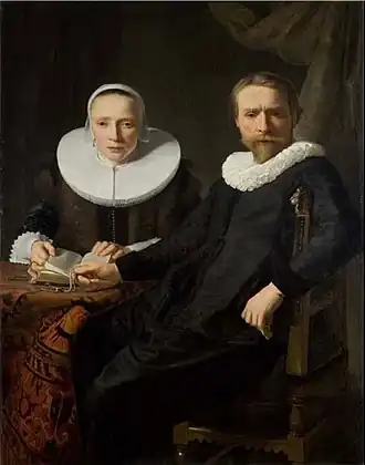 In the Portrait of a Gentleman (1630–1640, Beecroft Art Gallery) de Vries employed a unique technique to render the sitter's broad lace collar: he applied the paint with his thumb. Close examination reveals his thumbprints still visible in the paint.[7] He painted several wedding portraits in which the man is situated on the left and the woman on the right, which was unusual for that time.[8]