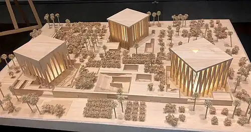 The campus is designed by Ghanaian-British architect David Adjaye, founder of the design firm Adjaye Associates. Several architectural styles which are commonly found in mosques, churches, and synagogues are used, capturing shared values between Islam, Christianity, and Judaism.[18][11][19][13][20] Each house of worship is intentionally built at the same height (30 meters each side) and dimensions but each has unique features.[21][22]