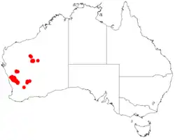 It is found in scattered populations in the Wheatbelt and Mid West regions of Western Australia.[1] Its range extends from near Mingenew southeast to the between Ballidu and Kalannie. Additionally, there are outliers at Jingemarra Station approximately 200 kilometres (124 mi) north east of Kalannie and near Mount Jackson approximately 200 kilometres (124 mi) east of Kalannie.[3]