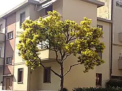 Acacia dealbata is widely cultivated as an ornamental plant in warm temperate regions of the world,[3] and is naturalised in some areas, including Sochi (Black Sea coast of Russia), southwestern Western Australia, southeastern South Australia, Norfolk Island, the Mediterranean region from Portugal to Greece and Morocco to Israel, Yalta (Crimea, Ukraine), California, Madagascar,[21] southern Africa (South Africa, Zimbabwe), the highlands of southern India,[14] south-western China and Chile.[6][22][23][24][25] It is hardy down to −5 °C (23 °F),[26] but does not survive prolonged frost.[3] It prefers a sheltered position in full sun, with acid or neutral soil. It has gained the Royal Horticultural Society's Award of Garden Merit.[26][27]