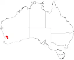 It is native to an area in the Wheatbelt region of Western Australia growing in sandy to sandy-loamy soils often over or around areas of laterite.[1] The distribution of the shrub is limited to a small area from between Wongan Hills and Piawaning as a part of sandy heathland communities where it is often associated with Melaleuca uncinata.[2]