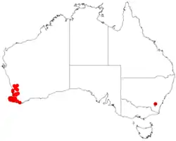 It is native to an area in the Wheatbelt and South West regions of Western Australia where it is found growing in gravelly lateritic soils.[1] The shrub has a scattered distribution from around York in the north down to around Augusta in the south and out to near Denmark in the south east as a part of Eucalyptus woodland or Eucalyptus marginata forest communities.[2]