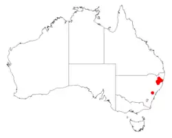 The shrub has a limited distribution in upper basin of the Macleay River in New South Wales to the east of Armidale.[2] It is reasonably widespread in the escarpment gorges from around Apsley Falls to Wollomombi Falls and also in the Guy Fawkes River National Park usually in low woodland or open forest communities situated in steep country.[1]