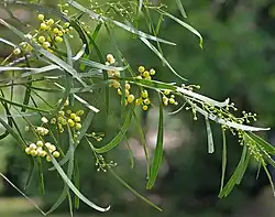 The tree has a slender and erect habit and typically grows to a height of up to 10 metres (32.8 ft). It has a bushy crown and usually has a single stem but can divide into several stems at ground level[1] which have smooth grey coloured bark. The branchlets are usually pendulous and are angled or flattened and a reddish-brown often covered with a white powdery finish.[2] It has straight or shallowly recurved, glabrous, blue-green to grey-green phyllodes[1] that have a narrowly oblanceolate to narrowly elliptic or linear shape with a length of 7 to 22 cm (2.8 to 8.7 in) and a width of 3 to 15 mm (0.12 to 0.59 in). It blooms throughout the year[3] but most heavily between September and January producing racemose inflorescences with spherical flower-heads containing between 18 and 50 flowered golden to pale yellow coloured flowers. After flowering linear brown seed pods form that are up 16 cm (6.3 in) in length and 5 to 17 mm (0.20 to 0.67 in) wide with a firm papery texture. The dull to slightly shiny dark brown to black seeds within the pods have an oblong to oblong-elliptic shape and a length of 4 to 6 mm (0.16 to 0.24 in).[2]