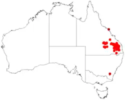 It is endemic to south eastern Queensland where the bulk of the population is found between Cracow, Condamin, Kingaroy and Eidsvold with scattered smaller populations in the Carnarvon National Park and Salvator Rosa National Park. where it grows in sandy to sandy loam soils over sandstone as a part of open Eucalyptus woodland communities.[1]