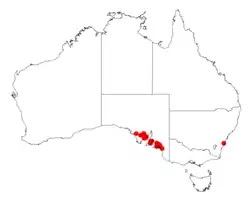 It is endemic to some small areas on the Eyre Peninsula in South Australia near Arno Bay extending to the Yorke Peninsula near Curramulka and then between the Gilbert River and Monarto where it is found growing in calcareous sandy or sandy-loamy soils as a part of open scrubland communities[3] that are dominated by Eucalyptus species.[2] The total area over which the shrub is found has been calculated as 4,976 km2 (1,921 sq mi).[1]