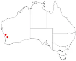 It is native to a small area in the Wheatbelt region of Western Australia where it is commonly situated on hillslopes growing in gravelly lateritic soils.[2] It has a very limited range in the Wongan Hills area where it is thought to be an opportunist in disturbed areas that is long living. It is usually found as a part of Mallee and acacia shrubland communities, and often found with Allocasuarina campestris, Petrophile shuttleworthiana, Eucalyptus longicornis, Acacia acanthoclada, Acacia lasiocarpa and Acacia pulchella.[1] In 2006 there was an estimated 10,400 mature individual plants situated within fifteen separate populations found over an area of approximately 60 km2 (23 sq mi).[4]