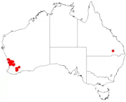 It is native to an area in the Wheatbelt region of Western Australia where it is found on hills and breakaways growing in lateritic soils. It has a disjunct distribution from around Dandaragan in the north to around Gnowangerup in the south[1] growing in gravelly clay and sandy soils as a part of Eucalyptus wandoo woodland communities.[2]