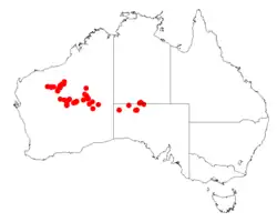 It is native to a large area in the Pilbara and northern Goldfields regions of Western Australia[2] where its distribution is scattered and its range extends from around 150 km (93 mi) north west of Wiluna in the south then eastwards into the Gibson Desert. In the north it is found on Balfour Downs and Ethel Creek Stations as well as in the Hamersley Range. The species shares much of the range of Acacia thoma. It is often situated on gently undulating plains and stony hardpan plains with skeletal shallow red-brown loamy soils mixed with ironstone pebbles and cobbles as a part of open Mulga woodland communities, sometimes with a spinifex understorey.[1]