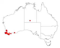 It has a discontinuous distribution and is found as far north as Perth and south through the Peel, South West and Great Southern regions as far south as Albany and east as Tambellup. It is found in swampy areas, along creeklines and on rocky hillsides where it grows in damp sandy or loamy soils and in gravelly lateritic soils.[1] The shrub is often part of the understorey of Paperbark or Jarrah woodland communities but can be found in regenerating heath land communities.[2]