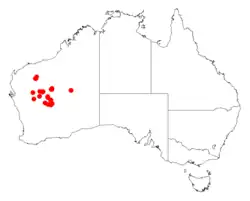 It is native to an area in the Mid West, Goldfields and Pilbara regions of Western Australia where it has a[2] scattered distribution from the Pilbara region in the from the east of Paraburdoo north down to around Meekatharra in the south west and Leinster in the south extending out to around Mount Nossiter in the Little Sandy Desert in the eastern edge of its range. It is often situated on ridges and rocky slopes near the base of ranges composed of banded ironstone growing in skeletal soils as a part of open shrubland communities where it is usually associated with Acacia aneura, Acacia sibirica and Eremophila jucunda.[1]