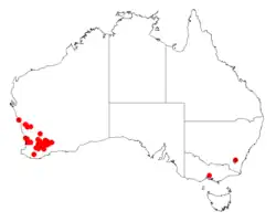 It has a scattered distribution from the Mid West, Wheatbelt, Peel and Great Southern regions. It is found as far north as Three Springs, south as Mount Barker and east as Lake Grace. It is found in swamps, on hill sides and among granite outcrops where it grows in sandy granitic or lateritic soils.