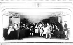 From the 1870s onwards theater became a popular pastime at the parish level.[17] During the Acadian Renaissance, as Acadia experienced a period of significant socio-economic change, the role of the storyteller diminished, while people engaged in a greater variety of activities outside the home.[24] Acadian theater can be considered an extension of the evening gatherings. Notably, at this time, people avoided using the term "theater" and preferred terms such as "session," "recreational evening," "concert," or "amateur evening."[24] This usage appears to have been due to the nature of the performances,[24] which often included singing and music and did not necessarily fit a strict definition of theater. It was mainly to avoid confusing these performances with cinema —also called theater in its early days— which was condemned by the clergy.[24] The theater itself had often been criticized by the clergy in Quebec.[24]