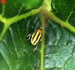 In the United States, two species are major pests of cucurbits, the striped cucumber beetle (Acalymma vittatum), which is mainly found east of the Mississippi River, and Acalymma trivittatum which is mostly found west of the Mississippi.[2] Adults feed on young leaves, and larvae can damage roots.[3] A. vittatum vectors bacterial wilt Erwinia tracheiphila Holland (Enterobacteriales: Enterobacteriaceae) to the plants as it pierces plant stems to suck juices.[4]