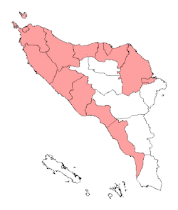 Dialects of the Acehnese language that are found in the Aceh Besar Regency valley are divided into two major groups, namely the Tunong dialect for dialects in the highlands and Baroh dialect for dialects in the lowlands.[38] Most of the dialects that are used in Aceh Besar Regency and Daya, shows that settlements in that region have existed longer than any other regions.[38] There are also many dialects in Pidie Regency, although not as much as in Aceh Besar Regency and Daya.[38] Dialects on the east coast of Pidie Regency and in southern Daya tend to be more homogeneous, so much so that it is co-related with the migration that came along with the expansion of power of the Aceh Sultanate after the 1500s.[38]