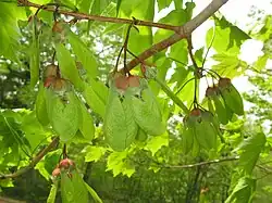 The typically 3 cm long samaras hang from pendulous racemes, and drop in October. Bristles sheath the area containing the seeds, supporting the retained curly stigmas which have a hornlike appearance. It is these horns which give the plant its scientific and common names.[3]