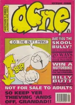 Acne was launched in August 1991, styling itself as "Britain's first alternative kids' comic!",[1] it was initially produced by the editors responsible for the adult comic Smut.[2] The comic's lead character was Billy Butt, a delinquent skinhead. Acne contained parodies of popular culture and street safety, alongside more serious anti-drug content with its younger readership in mind. Although it was aimed at children, the comic contained violent themes and the liberal use of swear words. To avoid retailers putting the publication in the adult section front covers explicitly stated that it was for children.[3]