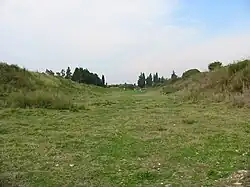This ancient stadium was located in the so-called 'Proasteion' (sacred grove) of the Graeco-Roman city of Nikopolis. Together with the nearby gymnasium, theatre and hippodrome it was the location of the famous Actian Games.[6][7] These games, which featured athletic, equestrian and musical events,[8] were first held in 27 BCE to celebrate the victory of the first Roman emperor Augustus over his adversaries, Marc Antony and his Egyptian wife Cleopatra. They were held every four years up to the mid-3rd century CE. Dating from just after the city's foundation, the ancient stadium of Nikopolis has two semicircular ends (sphendones), typical of the amphitheatre type that was in use during the first 200 years of the principate. The stadiums of ancient Laodikeia (near Pamukkale, Turkey) and Aphrodisias (Geyre, Turkey) have a similar architecture.