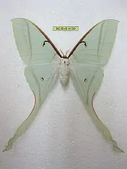 Actias rhodopneuma, colloquially known as the pink spirit moth, is a moth in the family Saturniidae. It is found in China, Laos, Vietnam, Burma, Thailand and India. While there are not many reports about their host plants in the wild, in captivity they have been raised on Liquidambar, Cotinus, Prunus, Salix and Rhus. Usually it occupies the mountainous regions within its natural range and is found from 1000 m up to 4500 m in the mountains. [1]