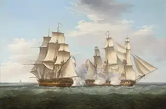 ![]() HMS Ethalion in action with the Spanish frigate Thetis off Cape Finisterre, 16th October 1799 Thomas Whitcombe, 1800 | |||||||