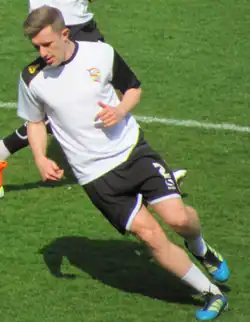 Targeted by manager Dean Glover, Port Vale continued the hunt for his signature even after Glover's departure.[16] Yates decided to wait until a manager was appointed before signing for the club,[17] and after Micky Adams was made manager Yates signed a two-year deal with the Vale.[18] He was forced to wait until 22 August before he made his competitive debut for the club,[19] as Sam Stockley had impressed in the right-back position in the pre-season and opening few games of the 2009–10 season. He was transfer listed in late September, along with the entire Port Vale squad, after manager Micky Adams saw his team slip to a third consecutive defeat.[20] Following Stockley's retirement in November, Yates was expected to fill the void,[21] though he faced competition for the right-wing-back spot from Anthony Griffith.[22] In his first game in almost a month he scored his first goal at Vale Park, scoring the opener of a 1–1 draw with Stevenage Borough in the FA Cup first round.[23][24] By February 2010 he was managing to maintain a first-team place,[25] helped by the team's change of formation from 3–4–3 to 4–4–2.[26]