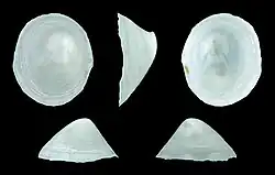 The maximum recorded shell length is 20.3 mm.[2] The size of the ovate shell varies between 8 mm and 20 mm. It is thin and whitish. The apex presents an appearance as if an embryonic tip (perhaps spiral) had fallen and been replaced by a peculiarly blunt ovate apex, which in the young shell is nearly marginal, posterior and to the left of the middle line, but in the adult is considerably within the margin, curved downward and backward and much more asymmetrical. The sculpture of the shell shows faint grooves radiating from the (smooth) apex and reticulated by the stronger concentric lines of growth, beside which the extremely inflated arch of the back is somewhat obscurely concentrically waved. The shell has a polished appearance over the sculpture. The thin margins are sharp. The interior of the shell is smooth and somewhat polished. The scar of the pedal muscle is narrow and at a considerable distance within the margin. The anterior ends of the scar are enlarged and hooked backward on their inner edges. These ends are connected by a line broadly arched forward and marking the attachments of the mantle to the shell over the head.[3]