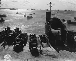 The chosen landing site was a small beach on the south shore of Hyane Harbour near the Momote airstrip. The airstrip could be seized quickly; but the surrounding area was mangrove swamp, and the harbour entrance was only about 750 yards (700 m) wide. "Since the whole operation was a gamble anyway," Samuel Eliot Morison noted, "one might as well be consistent."[33] The gamble paid off. The Japanese had not anticipated a landing at this point and the bulk of their forces were concentrated to defend the beaches of Seeadler Harbour, on the other side of the island.[34] The weather on 29 February 1944 was overcast with a low cloud ceiling that prevented most of the planned air strike. Only three B-24s and nine B-25s found the target. The naval bombardment was therefore extended for another 15 minutes.[35] Each APD lowered four LCPRs (Landing Craft, Personnel, Ramped). Each LCPR carried its maximum load of 37 men, who boarded by climbing over the APDs' sides and down cargo nets.[35] The unarmoured LCPRs were still used because davits had not been strengthened to carry the heavier, armoured LCVP (Landing Craft, Vehicle, Personnel).[36]