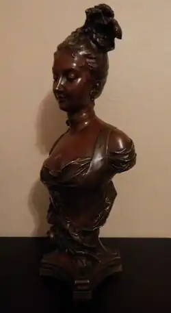 Gaudez was born in Lyon, France, on 2 February 1845. He was a pupil of Francois Jouffroy at the École des Beaux-Arts in Paris in 1862. He made his debut at the Paris Salon in 1864.[1] Gaudez worked almost exclusively in bronze and he produced a wide array of sculptures, ranging from genre subjects to military and patriotic themes.[2] His earlier work was mostly of a classical nature[3] but in the latter part of his career he produced some sculpture that can be categorized as Art Nouveau.